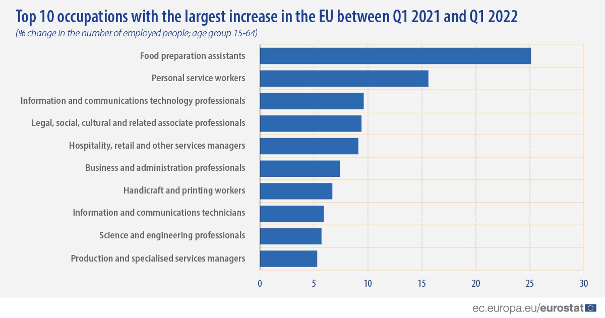 Tra il primo trimestre del 2021 e lo stesso trimestre del 2022, l’occupazione “che ha visto l’aumento percentuale più marcato del numero di occupati nell’Ue è stata quella degli assistenti alla preparazione del cibo”, con un aumento del 25,1%, passando da quasi 1,1 a quasi 1,4 milioni di persone. Lo riferisce uno studio diffuso oggi da Eurostat. Il secondo aumento più grande, 15,6%, “è stato nel gruppo dei lavoratori dei servizi personali, che riguarda assistenti di viaggio, conduttori, guide, cuochi, camerieri e baristi, parrucchieri, estetisti e addetti alle pulizie”. Nel primo trimestre del 2022, questo gruppo professionale aveva 7,6 milioni di lavoratori.