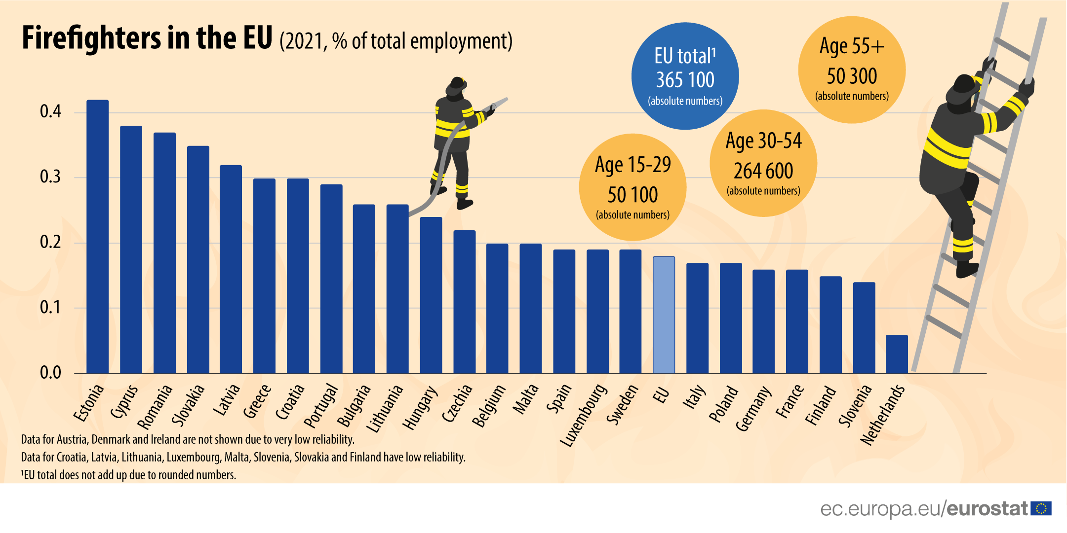 “Gli incendi divampati in tutta Europa hanno devastato migliaia di ettari di terra in Francia, Portogallo, Spagna, Italia e Grecia, mettendo alla prova i vigili del fuoco nei paesi colpiti”. Lo si legge in un rapporto diffuso da Eurostat, secondo il quale “nel 2021 circa 365mila persone sono state impiegate come vigili del fuoco professionisti nell’Ue, pari allo 0,2% dell’occupazione totale nell’Unione”. Estonia, Cipro, Romania e Slovacchia (0,4% dell’occupazione totale) hanno registrato la quota più alta di vigili del fuoco nelle rispettive forze di lavoro. In termini di età, la maggior parte dei vigili del fuoco è relativamente giovane, con le fasce di età 35-39 anni e 40-44 anni con il numero più alto di persone, circa 61.000 ciascuna. Ci sono anche oltre 50mila vigili del fuoco di età superiore ai 55 anni.