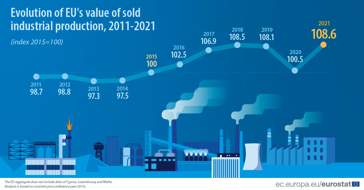 “Dopo due anni consecutivi di calo della produzione industriale, compreso un calo del 7% nel 2020, la produzione di manufatti dell’Ue è rimbalzata nel 2021”. Gli ultimi dati di Eurostat indicano un aumento dell’8% della produzione di manufatti nel 2021 rispetto al 2020. “Tra il 2011 e il 2014, la produzione dell’Ue è leggermente diminuita per due anni consecutivi prima di iniziare un graduale aumento fino al 2018. Nel 2019 il valore della produzione venduta ha registrato un lieve calo, per poi diminuire più drasticamente nel 2020 a causa degli effetti della pandemia”, si legge in uno studio pubblicato oggi. “L’epidemia di Covid-19 e le relative misure di contenimento ampiamente introdotte dagli Stati membri dell’Unione hanno avuto un impatto significativo sulla produzione industriale nel 2020, ma il 2021 ha mostrato aumenti della produzione in tutti i gruppi di attività industriali”. In termini nominali, il valore della produzione venduta dell’Ue è balzato da 4.581 miliardi di euro nel 2020 a 5.209 miliardi di euro nel 2021.