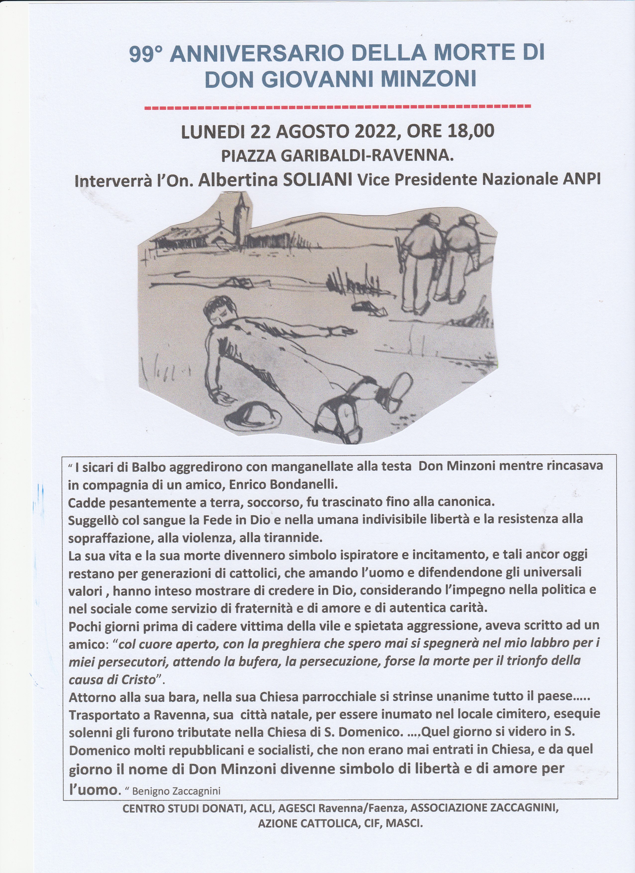 È in programma per oggi, 22 agosto, alle 18 in piazza Garibaldi a Ravenna, una cerimonia per ricordare la figura di don Giovanni Minzoni, che la sera del 23 agosto 1923 fu assalito da due squadristi fascisti e colpito alle spalle con sassi e bastoni che gli provocarono la morte. “Ricordare don Minzoni, ucciso in modo vigliacco da fascisti, ci richiama in ogni tempo l’essere testimoni credibili contro ogni forma di oppressione della libertà. Ne abbiamo commemorato il martirio ma soprattutto la vita e l’impegno sociale”. Questo si legge nel comunicato diramato da Acli Emilia Romagna, organizzatore dell’evento assieme a Centro studi Donati, Agesci Ravenna-Faenza, Associazione Zaccagnini, Azione Cattolica, Cif, Masci, con il patrocinio del Comune di Ravenna. Nell’occasione interverrà Alberta Soliani, senatrice e presidente dell’Istituto Alcide Cervi, per la memoria della resistenza. “Don Minzoni capì, anche qui anticipando i tempi, che il Vangelo e la Chiesa hanno una parola da dire al mondo, ed entra nelle questioni sociali del momento e della sua terra. E fu qui in un delicatissimo momento della nostra storia e nell’approfondimento del Vangelo che egli capi molto bene il valore della vera libertà, la prima prerogativa della natura umana. Senza libertà non si fa che accettare la situazione e anche quando sembra che la mancanza di libertà assicuri l’ordine, il fuoco cova sempre sotto la cenere ed esploderà tanto più violento quanto più è stato contenuto”. Queste le parole di Emiliano Manfredonia, presidente nazionale Acli, in occasione della cerimonia di commemorazione di don Minzoni del 23 agosto del 2021 e citate nel comunicato che prosegue: “‘Senza libertà non c’è progresso, né umano, né sociale e nemmeno religioso’. Queste le idee e la coscienza di don Minzoni e di quanti specialmente giovani lo circondarono di comprensione, di affetto e di entusiasmo. Così egli fu prete, senza che la sua voce cessasse mai di proclamare il Vangelo nella vita e con il Vangelo ciò che da esso discende. La sua voce si spense in un rantolo. Se avesse ancora potuto parlare nell’agonia, forse le ultime parole sarebbero state queste ch’erano in sintesi la sua vita: predicare il Vangelo agli uomini, dare la liberta a ognuno, a tutti amore e, anche a chi l’aveva assassinato, il perdono”.