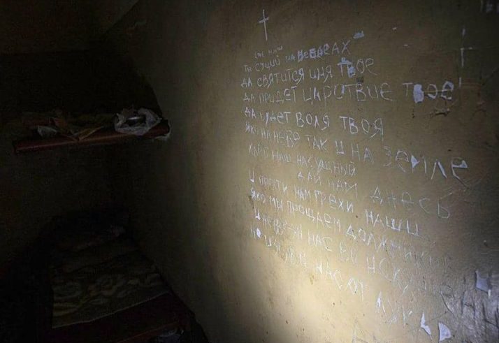 La preghiera del “Padre nostro” incisa in lingua russa sul muro di una delle stanze dove anche nella città di Balakliya venivano torturati gli ucraini. La foto è stata pubblicata dal capo della Polizia nazionale ucraina, Ihor Klymenko, sulla sua pagina Facebook. L’8 settembre scorso, era stato ufficialmente confermato che i soldati delle Forze armate ucraine avevano liberato parte della regione di Kharkiv, presa in precedenza sotto il controllo delle truppe russe. Man mano che le truppe ucraine avanzano e riprendono il controllo dei territori, stanno emergendo orrori e pratiche di tortura. Non bastavano le fosse comuni a Buscha e Irpin. La guerra è un’immensa distesa di dolori e orrori. Il muro su cui è stata incisa con la pietra la preghiera cristiana, è avvolto nel buio. Si trova in una stanza delle torture nel quartier generale dei russi nella città di Balakliya ora liberata. Sempre in queste ore, Kiev ha annunciato di aver scoperto altre camere della tortura nella regione di Kharkiv. Il capo della Polizia nazionale parla di almeno altre dieci camere scoperte in diverse località. La deputata Maryana Bezugla ha raccontato che all’interno delle stanze delle esecuzioni, sono stati ritrovati istruzioni sul “nazismo ucraino” incollate sui muri, una sedia con un martello, del nastro adesivo, dei guanti usati, anche tracce di sangue. Tra quegli orrori, anche la preghiera insegnata da Gesù agli apostoli. Non è dato di sapere quale storia nasconda questa invocazione al Dio della pace e della misericordia. L’unica cosa certa sono le scritte incise in russo, sul muro, di una preghiera che tra l’altro invoca il perdono e la vittoria finale del bene sulle tenebre: “Rimetti a noi i nostri debiti come anche noi li rimettiamo ai nostri debitori e non abbandonarci alla tentazione ma liberaci dal male”.