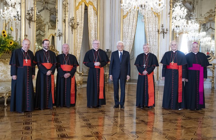 Il presidente della Repubblica, Sergio Mattarella, ha offerto oggi, al Palazzo del Quirinale, la tradizionale colazione in onore dei nuovi cardinali italiani nominati nel Concistoro del 27 agosto 2022: il card. Oscar Cantoni, vescovo di Como, il card. Giorgio Marengo, prefetto apostolico di Ulaanbaatar, il card. Arrigo Miglio, arcivescovo emerito di Cagliari, il card. Gianfranco Ghirlanda, già rettore della Pontificia Università Gregoriana, e il card. Fortunato Frezza, canonico della Basilica di San Pietro in Vaticano. Ne dà notizia il Quirinale spiegando che erano presenti anche il card. Pietro Parolin, segretario di Stato di Sua Santità, mons. Emil Paul Tscherrig, nunzio apostolico in Italia, e Francesco Di Nitto, ambasciatore d’Italia presso la Santa Sede.