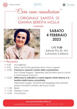 “Cura come consolazione – L’originale santità di Gianna Beretta Molla”. È questo il titolo del convegno che si terrà a Milano, sabato 4 febbraio alle 9.30, nel salone Pio XII, in via San Antonio 5, nell’ambito del programma delle celebrazioni per il centenario della nascita di santa Gianna Beretta Molla (1922-2022). L’evento di approfondimento culturale e religioso sulla “santa della porta accanto”, in vita figura esemplare di moglie, madre e medico, è stato promosso dall’Azione Cattolica ambrosiana, in stretta collaborazione con la comunità ecclesiale e civile di Magenta e Mesero e l’arcidiocesi di Milano.