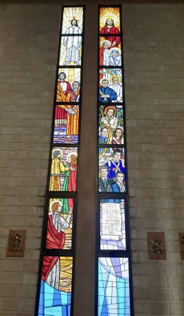 “La chiesa di Marconia, riedificata e inaugurata venticinque anni fa, sin dall’inizio ha inteso raffigurare scene del Vangelo attraverso il linguaggio della vetrata – spie il parroco, mons. Filippo Lombardi -. La prima vetrata, al tempo della costruzione della Chiesa, è stata il Rosone raffigurante Maria Assunta in cielo. Poi negli anni successivi sono state realizzate, alla destra del presbiterio, due vetrate, alte oltre sette metri, raffiguranti le Nozze di Cana e la Pentecoste. Alla sinistra del presbiterio altre due vetrate: la Crocifissione e l’Ultima cena. Nei catini del transetto, a destra la Natività e a sinistra il Battesimo di Gesù. Per ricordare l’Anno di san Giuseppe, 2021, sono state realizzate, a destra dell’assemblea, le vetrate dell’Annunciazione e del Sogno di san Giuseppe. Da ultimo, in questi giorni, alla sinistra dell’assemblea: Le beatitudini e la Trasfigurazione, mentre, la cappella dedicata a san Giovanni Bosco è corredata dalla vetrata raffigurante la Creazione, ispirata alla Laudato si’ di Papa Francesco”.