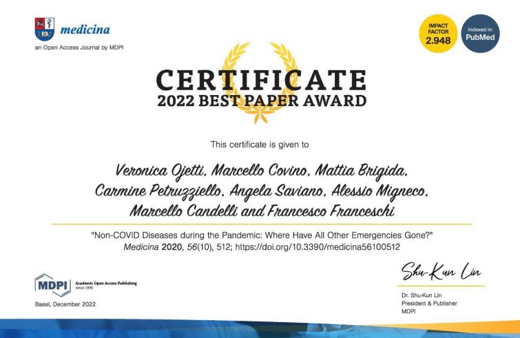 Un articolo “visionario” pubblicato nel 2020 sulla rivista scientifica internazionale Medicina da un gruppo di urgentisti del Pronto soccorso di Fondazione Policlinico universitario Agostino Gemelli Irccs (primo nome Veronica Ojetti, all’epoca responsabile Uos di Procedure in Emergenza-Urgenza presso il Gemelli) ha ricevuto il premio “Medicina 2022 Best Paper”, rilasciato dal team editoriale della rivista Medicina, presieduto dal direttore Edgaras Stankevičius. “Essendoci accorti di una notevole riduzione degli accessi in pronto soccorso, nel periodo iniziale della pandemia – spiega Ojetti, attualmente direttore Uoc di Medicina interna presso l’Ospedale San Carlo di Nancy di Roma e docente di Medicina d’emergenza urgenza presso l’Università Cattolica,- siamo andati ad esaminare la tipologia degli accessi presso il Pronto soccorso” del Gemelli “dal 21 febbraio 2020 (giorno del primo caso italiano di Covid-19, Mattia Maestri, il paziente 1 di Codogno) fino al 31 marzo dello stesso anno, quindi i primi 40 giorni di Covid-19 in Italia”. Analizzando tutti gli accessi e confrontando questo periodo con lo stesso periodo del 2018 e del 2019 si è registrata una drastica riduzione degli accessi (circa il 40%), limitati solo a codici rossi e gialli, quindi legati solo ad “una grave necessità; gli altri si erano probabilmente rivolti ai medici di famiglia e ai servizi territoriali, come dovrebbe accadere sempre in un sistema virtuoso”. “Purtroppo – prosegue Ojetti – abbiamo riscontrato anche una netta riduzione degli accessi per dolore cardio-toracico (-46%), segno che le persone con dolore al petto, che potrebbe essere sintomo di infarto o di angina, non facevano più riferimento al Ps, decidendo di restare a casa. La cosiddetta scomparsa degli infarti nel periodo peggiore della pandemia è stata in seguito confermata da tanti altri studi, che hanno anche evidenziato come le morti ‘casalinghe’ per sindrome coronarica acuta siano triplicate, mentre le procedure di angioplastica primaria si sono ridotte del 40% in questo primo periodo.