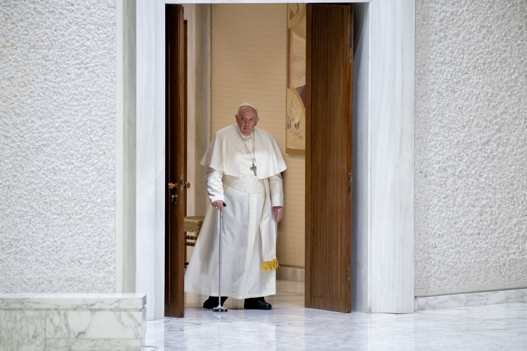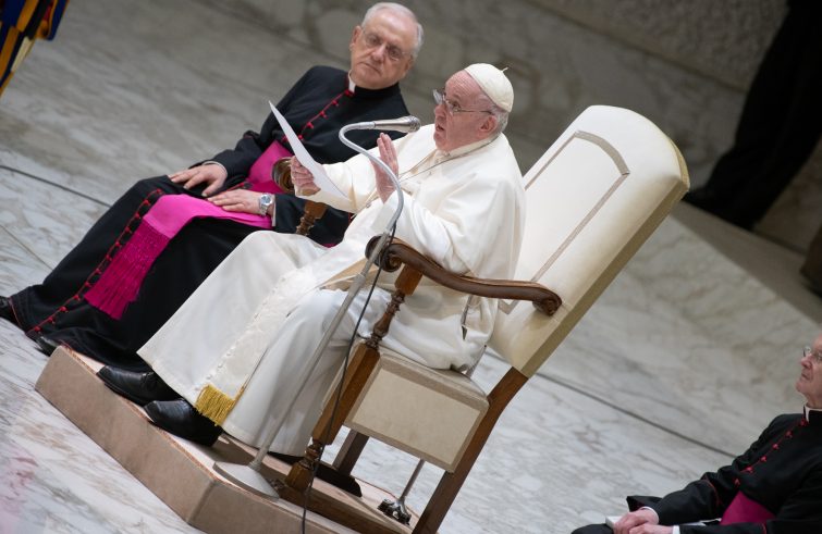 “Prima di iniziare questa catechesi vorrei che ci unissimo a quanti, qui accanto, stanno rendendo omaggio a Benedetto XVI e rivolgere il mio pensiero a lui, che è stato un grande maestro di catechesi”. È l’omaggio di Papa Francesco al suo predecessore, all’inizio della catechesi in Aula Paolo VI, dove è arrivato con il bastone e senza carrozzella. “Il suo pensiero acuto e garbato non è stato autoreferenziale, ma ecclesiale, perché sempre ha voluto accompagnarci all’incontro con Gesù”, ha proseguito Francesco: “Gesù, il Crocifisso risorto, il Vivente e il Signore, è stata la meta a cui Papa Benedetto ci ha condotto, prendendoci per mano. Ci aiuti a riscoprire in Cristo la gioia di credere e la speranza di vivere”.