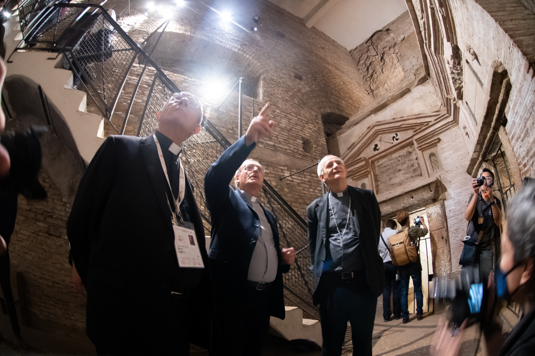 La XVI Assemblea generale ordinaria del Sinodo dei Vescovi, che si tiene in Vaticano dal 4 al 29 ottobre, ieri ha vissuto il momento del pellegrinaggio, svoltosi nelle catacombe di Roma dove nel III secolo furono custodite, secondo la tradizione, le spoglie degli apostoli Pietro e Paolo per salvarle dalla persecuzione. Un’esperienza utile per rafforzare la comunione attraverso la visita dei luoghi che fanno capire cosa significhi accogliere pienamente la Parola e seguire con fede l’esempio di Cristo fino al sacrificio ed alla passione, confrontandosi con i martiri della Chiesa per prendere spunto dalla loro fede per vivere il percorso sinodale e annunciare il Vangelo. Un momento significativo iniziato nella basilica di San Sebastiano, con un momento di preghiera e la presentazione di mons. Pasquale Iacobone, presidente della Pontificia Commissione di Archeologia Sacra, e proseguito poi a gruppi nella catacombe di San Sebastiano, San Callisto e Santa Domitilla.
