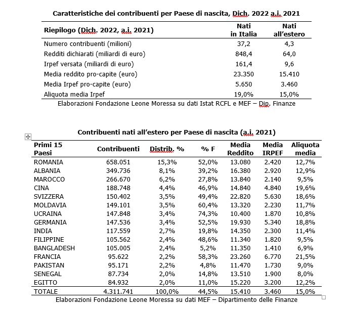 Continua l’aumento degli imprenditori immigrati, che nel 2022 sono 761mila (10,1% del totale). In dodici anni (2010-22), gli immigrati sono cresciuti (+39,7%) mentre gli italiani sono diminuiti (-10,2%). L’incidenza più alta è al Centro-Nord e nei settori di costruzioni, commercio e ristorazione. È quanto emerge dal Rapporto annuale 2023 sull’economia dell’Immigrazione, curato dalla Fondazione Leone Moressa e presentato oggi a Roma. Dopo la pandemia è tornato a crescere anche il numero di contribuenti immigrati. Si tratta di 4,3 milioni di contribuenti (10,4% del totale), che nel 2022 hanno dichiarato redditi per 64 miliardi di euro e versato 9,6 miliardi di Irpef. Rimane alto il differenziale di reddito pro-capite tra italiani e immigrati (circa 8mila euro annui di differenza), conseguenza diretta della concentrazione occupazionale. Rimane positivo il saldo tra il gettito fiscale e contributivo (entrate, 29,2 miliardi) e la spesa pubblica per i servizi di welfare (uscite, 27,4 miliardi), con +1,8 miliardi di euro in attivo. Gli immigrati, prevalentemente in età lavorativa, hanno infatti un basso impatto sulle principali voci di spesa pubblica come sanità e pensioni.