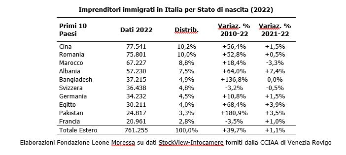 Continua l’aumento degli imprenditori immigrati, che nel 2022 sono 761mila (10,1% del totale). In dodici anni (2010-22), gli immigrati sono cresciuti (+39,7%) mentre gli italiani sono diminuiti (-10,2%). L’incidenza più alta è al Centro-Nord e nei settori di costruzioni, commercio e ristorazione. È quanto emerge dal Rapporto annuale 2023 sull’economia dell’Immigrazione, curato dalla Fondazione Leone Moressa e presentato oggi a Roma. Dopo la pandemia è tornato a crescere anche il numero di contribuenti immigrati. Si tratta di 4,3 milioni di contribuenti (10,4% del totale), che nel 2022 hanno dichiarato redditi per 64 miliardi di euro e versato 9,6 miliardi di Irpef. Rimane alto il differenziale di reddito pro-capite tra italiani e immigrati (circa 8mila euro annui di differenza), conseguenza diretta della concentrazione occupazionale. Rimane positivo il saldo tra il gettito fiscale e contributivo (entrate, 29,2 miliardi) e la spesa pubblica per i servizi di welfare (uscite, 27,4 miliardi), con +1,8 miliardi di euro in attivo. Gli immigrati, prevalentemente in età lavorativa, hanno infatti un basso impatto sulle principali voci di spesa pubblica come sanità e pensioni.