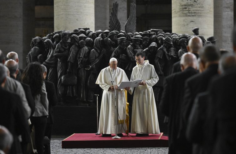 “Passare da un mondo chiuso a un mondo aperto, da un mondo in guerra a un mondo in pace”. E’ la rotta proposta dal Papa, nel momento di preghiera in piazza San Pietro per i migranti e i rifugiati, insieme ai partecipanti al Sinodo, presso la scultura “Angel Unawares” di piazza San Pietro. “Stasera l’abbiamo ascoltata pensando ai migranti, che vediamo rappresentati in questa grande scultura”, il riferimento alla scultura “Angel Unawares”: “uomini e donne di ogni età e provenienza, e in mezzo a loro gli angeli che li conducono’”. “La strada che da Gerusalemme portava a Gerico non era un cammino sicuro, come oggi non lo sono le numerose rotte migratorie che attraversano deserti, foreste, fiumi e mari”, il riferimento alla parabola del Buon Samaritano: “Quanti fratelli e sorelle oggi si ritrovano nella medesima condizione del viandante della parabola? Tanti! Quanti vengono derubati, spogliati e percossi lungo la strada? Partono ingannati da trafficanti senza scrupoli. Vengono poi venduti come merce di scambio. Vengono sequestrati, imprigionati, sfruttati e resi schiavi. Vengono umiliati, torturati, violentati. E tanti, tanti muoiono senza arrivare mai alla meta”.