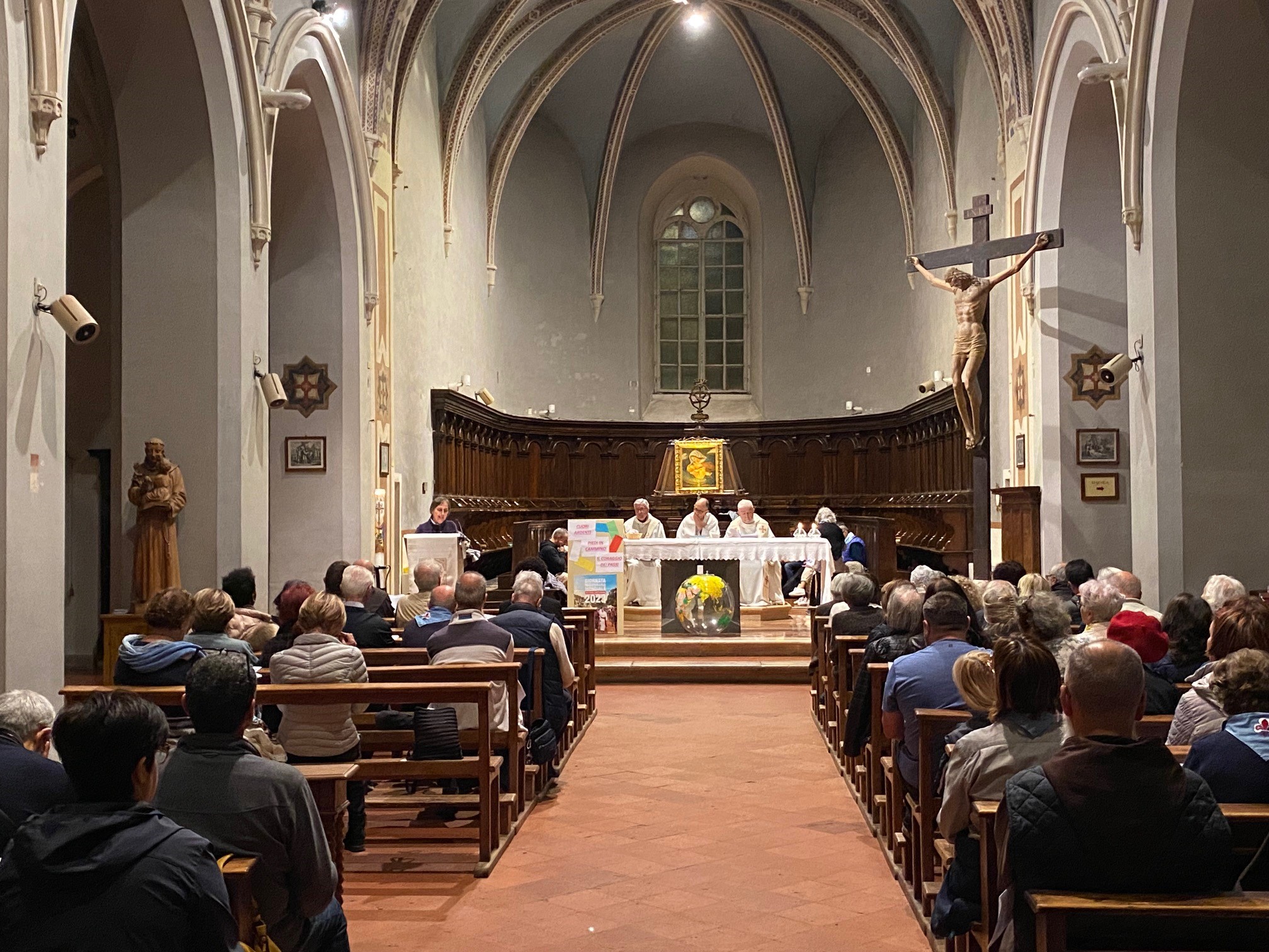 “Questa sera la nostra chiesa è diventata una basilica in cui ha trovato posto il mondo. Abbiamo sentito le voci del Sud Sudan, di Israele, del Perù e del Kosovo e nell’ascoltarle mi sono chiesto cos’è che fa di questa geografia il nostro mondo? Io credo che sia la scelta di restare con uno sguardo ben preciso anche quando avresti mille motivi per andartene. Lo stare potrebbe essere il contrario della missione, perché la missione viene associata all’andare, ma, come è appena stato ricordato, quanto è importante anche il fermarsi”. Così l’arcivescovo di Perugia-Città della Pieve, mons. Ivan Maffeis, nel commentare la Parola di Dio pronunciata alla veglia di preghiera tenutasi, ieri sera, 20 ottobre, nell’antico convento francescano in Monteripido di Perugia, in preparazione alla Giornata missionaria mondiale che la Chiesa celebra domani.