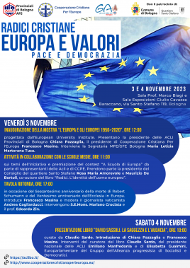 Le Acli Provinciali di Bologna organizzano una rassegna di eventi dal titolo “Europa e valori. Valori cristiani, pace e democrazia”, che si terrà il 3 e 4 novembre presso la sala “Marco Biagi” e la sala esposizioni “Giulio Cavazza del Baraccano” a Bologna (via Santo Stefano 119). “Vogliamo tenere vivi e diffondere – precisano le Acli – i valori fondanti dell’Unione europea, tra cui quelli di pace e democrazia, dell’impegno sociale e del supporto reciproco, ricordando le radici cristiane alla base dell’Unione”. Venerdì 3 novembre alle 17.00 interverrà mons. Mariano Crociata, presidente della Comece (Commissione degli episcopati dell’Ue), ed Edoardo Zin, biografo di Robert Schuman, per ricordare il 60° anniversario della morte di questo padre fondatore e per celebrare il 20° anniversario dell’esortazione apostolica “Ecclesia in Europa”. Sabato 4 novembre alle 10.00, invece, Claudio Sardo, giornalista e curatore del volume “David Sassoli. La saggezza e l’audacia”, presenterà il libro, assieme al presidente nazionale delle Acli Emiliano Manfredonia e l’europarlamentare Elisabetta Gualmini. In contemporanea, presso i locali del complesso del Baraccano, saranno esposti i pannelli della mostra “L’Europa e gli europei. 1950-2022”, che resterà aperta in entrambe le giornate.