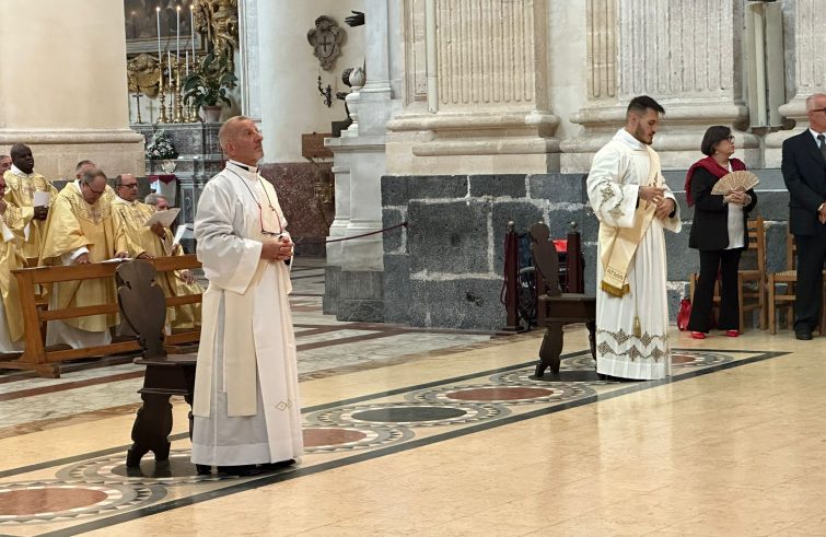 Oggi nella cattedrale di Catania, l’arcivescovo Luigi Renna ha ordinato sacerdoti don Alfio Caruso, della comunità Maria SS. Assunta di Adrano, e don Sebastiano Scamporino, della comunità parrocchiale S. Agata al Borgo di Catania. Don Sebastiano Scamporino, giovane seminarista di 28 anni, originario della diocesi di Comiso, ha scelto di completare il suo percorso formativo a Catania e di essere incardinato nella diocesi etnea. Don Alfio Caruso ha deciso di continuare a servire la Chiesa come presbitero, dopo aver operato al suo interno per 23 anni come diacono permanente. Padre di quattro figli, don Alfio ha maturato tale scelta dopo la prematura scomparsa della moglie, Rita Monachino, nel 2019. Uno dei suoi figli, Daniele, ha deciso peraltro di intraprendere il proprio percorso vocazionale nel Seminario “Redemptoris Mater” a Roma, per diventare sacerdote nel contesto del cammino neocatecumenale. “Siete arrivati a quest’oggi attraverso strade diverse, e sotto certi aspetti imprevedibili”, ha dichiarato l’arcivescovo di Catania nell’omelia, aggiungendo: “Quando si ha a cuore una comunione sostanziale, scevra da apparenze ed ipocrisia; quando si vive il servizio al popolo di Dio lasciandoci guidare dall’obbedienza; quando quel ‘per tutta la vita’ non ci fa guardare l’orologio, ma ci fa spendere in ogni giorno, come umili servi, allora i frutti del Regno di Dio verranno, anche se ci sembrerà di lavorare invano”.