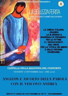 La Chiesa italiana celebra la terza Giornata nazionale di preghiera per le vittime e i sopravvissuti agli abusi, per la tutela dei minori e delle persone vulnerabili. In vista di questa occasione la diocesi di Arezzo-Cortona-San Sepolcro promuove venerdì 17 novembre un Angelus e ascolto della Parola di Dio con il vescovo Andrea Migliavacca a partire dal tema “La bellezza ferita. ‘Curerò la tua ferita e ti guarirò dalle tue piaghe’ (Ger. 30,17)”. L’iniziativa, che si svolge a partire da mezzogiorno nella cappella della Madonna del Conforto, viene trasmessa in diretta su Tsd, visibile nel canale 85 in tutta la Toscana e in streaming all’indirizzo www.tsdtv.it/live.