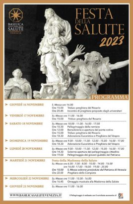 Questa sera alle 20.45 vi sarà una apertura serale della basilica e un momento di preghiera curato dagli studenti universitari veneziani. Centro di tutte le celebrazioni la messa solenne presieduta dal patriarca Moraglia martedì 21 alle ore 10, che sarà anche trasmessa in diretta televisiva su Antenna 3 (canale 10). Alla messa parteciperanno le autorità civili e militari, il Capitolo della cattedrale di San Marco, le IX Congregazioni del clero veneziano, i religiosi ed i rappresentanti delle Scuole grandi e degli Ordini cavallereschi. Il primo atto solenne, invece, sarà l’apertura del ponte votivo sabato 18 alle ore 12 con la benedizione del patriarca. Lunedì 20 novembre ci sarà in serata il pellegrinaggio dei giovani con Moraglia, che partirà da campo San Maurizio alle 18.30 e terminerà alla Salute con la testimonianza del gruppo musicale “The Sun”.