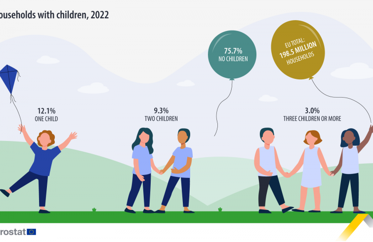 In the 27 countries of the European Union, there were nearly 200 million households (out of a total of 448 million inhabitants) in 2022, including households with only one (single, separated or divorced, elderly or widowed people living alone…) or more persons. Slightly less than a quarter of these households (24.3%) included children, according to a study published by the Statistical Office of the European Commission Eurostat. About 10% of households included either 1 child (12.1%) or 2 children (9.3%), while only 3.0% of the EU’s households included 3 children or more.