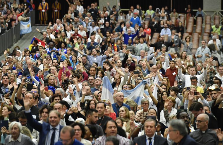 Gremita l’Aula Paolo VI, in Vaticano, per l’udienza di Papa Francesco con i membri di Charis, il servizio internazionale della Santa Sede per il Rinnovamento Carismatico Cattolico, che, dal 2 novembre fino a oggi, si sono ritrovati a Roma per l’evento dal titolo “Chiamati, trasformati ed inviati”. Il card. Raniero Cantalamessa, assistente ecclesiastico di Charis, nell’attesa dell’ingresso del Santo Padre, sta tenendo una meditazione.