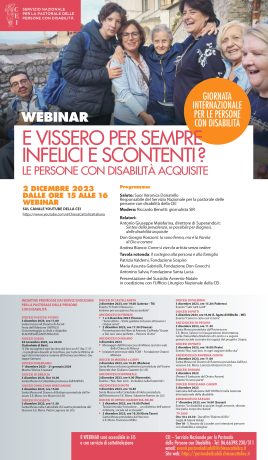 “E vissero per sempre infelici e scontenti? Le persone con disabilità acquisite” è il tema del webinar che si svolgerà domani, sabato 2 dicembre, dalle 15 alle 16, sul canale YouTube della Cei. A organizzarlo, il Servizio nazionale in occasione della Giornata internazionale delle Persone con disabilità. Sarà accessibile in LIS e con servizio di sottotitolazione.