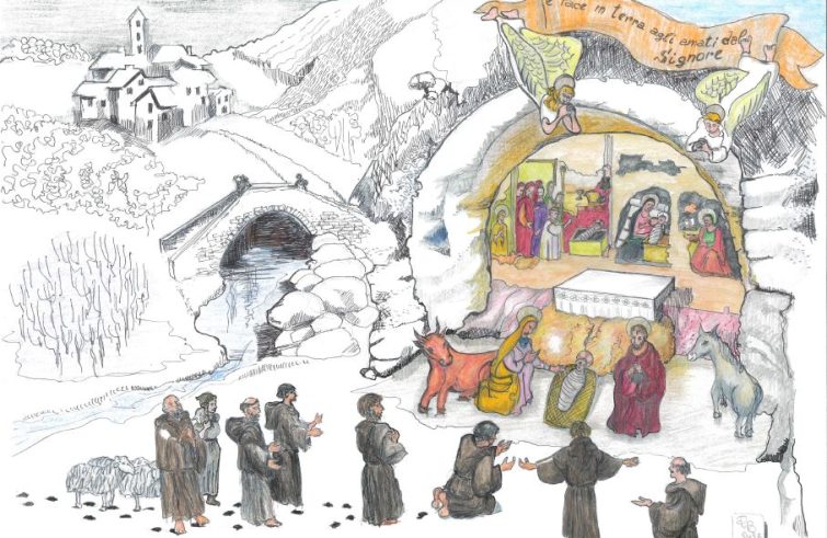 Il presepe di quest’anno, allestito dal personale del Servizio Tecnico della Policlinico Gemelli Irccs, si ispira al presepe di Greccio, l’affresco della Natività che San Francesco d’Assisi fece rivivere nel Natale del 1223 e che quest’anno celebra l’ottavo centenario. Di fronte alla Natività trovano collocazione cinque statuine di frati, di cui uno inginocchiato che raffigura San Francesco, realizzate dalla costumista D’Aria Francesca di Grassano (Matera). Le altre statuine, ovvero i tre re Magi, alcuni pastori e poche altre, sono state offerte da Enrico Mitrano (di sua proprietà e tutte con la stessa tecnica dei cinque frati: “vestite”), dipendente del Gemelli, oggi in pensione, che ha realizzato l’intera opera, tutta costruita manualmente in laboratorio e poi assemblata al Policlinico Gemelli.