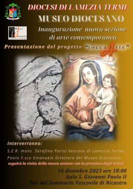 Sabato 16 dicembre, alle ore 18, presso l’aula San Giovanni Paolo II del Seminario vescovile di Nicastro, il Museo diocesano di arte sacra di Lamezia Terme inaugurerà una nuova sezione dedicata all’arte sacra contemporanea. Gli autori che hanno deciso di donare le opere esposte saranno presenti all’evento insieme al direttore del Museo Paolo Francesco Emanuele e al vescovo di Lamezia Terme, mons. Serafino Parisi. “L’evento nasce dall’esigenza, sempre più attuale, di avviare una riflessione sul contemporaneo nel suo senso più ampio, quindi non solo la decodifica di un linguaggio artistico declinato in pitture e sculture a volte di difficile comprensione, ma anche sulla valenza e l’uso delle nuove tecnologie utili a decifrare un messaggio di senso profondo attraverso metodologie più vicino al modo moderno”, spiega una nota della diocesi. “Saranno infatti proprio gli autori a introdurci in questo viaggio presentando brevemente le loro opere per poi mettersi a disposizione una volta dentro al museo per rispondere a tutte le domande circa le loro creazioni”, prosegue la nota. Insieme alla sezione di arte contemporanea sarà presentato anche il progetto “ toccArte” realizzato in collaborazione con l’istituto C. Rambaldi di Lamezia Terme grazie alla quale è stato realizzato una fedele riproduzione di un opere che potrà essere appunto “toccata” al fine di offrire agli ipovedenti e non solo un’esperienza tattile rispetto all’ opera che altrimenti non potrebbero essere manipolata. In occasione dell’evento sia l’Archivio storico diocesano sia la Biblioteca diocesana mons. Bonacci insieme con la sala dedicata Oreste Borrello resteranno aperte così da offrire al visitatore un’esperienza di visita completa del nostro inestimabile patrimonio culturale.