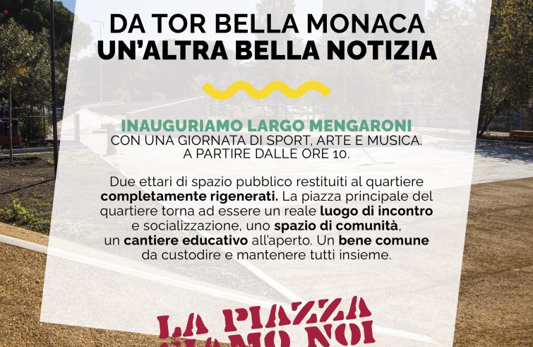 A seguire una grande festa di piazza che si protrarrà nel pomeriggio con la partecipazione di musicisti, writers, skaters, e un ricco programma di laboratori e attività per bambini. Dopo 10 mesi di lavori, esito di un lungo percorso di progettazione partecipata con i residenti e le associazioni locali, la piazza principale di Tor Bella Monaca viene restituita al quartiere completamente rigenerata, con uno spazio giochi per bambini, una grande skate plaza per i giovani, un colorato spazio multifunzionale aperto al gioco libero e agli spettacoli all’aperto, un campo da street basket, nuove sedute, alberature, punti luce, e una pavimentazione completamente rinnovata. Nasce lo stesso giorno il patto di collaborazione per la cura della piazza, uno dei primi a nascere a Roma dopo l’approvazione del regolamento comunale. Largo Mengaroni diventa così luogo di ritrovo e socializzazione, spazio di comunità, cantiere educativo a cielo aperto.