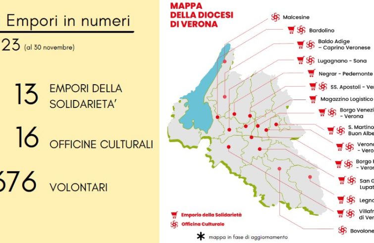 Negli scorsi giorni la Caritas diocesana veronese ha organizzato, alla presenza del vescovo, mons. Domenico Pompili, l’incontro di fine anno con i 13 Empori della solidarietà della diocesi di Verona, sparsi per l’intero territorio da Caprino a Legnago. Dai dati emersi da questo progetto solidale, risultano essere 7.497 le persone che hanno fatto almeno una spesa dal 1° gennaio 2023 al 30 novembre 2023, corrispondenti a 2.460 famiglie aiutate. Il totale dei prodotti distribuiti, grazie ai 676 volontari attivi, ammonta a 4.972 quintali. Ad accedere all’Emporio sono nel 77% dei casi nuclei familiari con più di un componente. I titolari della tessera necessaria all’accesso sono nel 66% dei casi donne e in maggioranza stranieri (69%). La tessera per accedere dura un anno per il 23% dell’utenza, 1-2 anni per il 27%, 2-3 anni per il 13%, 3 o più anni per il 37%. I valori dell’Isee delle famiglie fruitrici del servizio è per il 31% di esse da 0 a 3mila euro, per il 33% va da 3mila a 6mila euro, nel 9% dei casi supera i 6mila euro, mentre il 27% delle famiglie non ha compilato il dato sull’Isee. Parallelamente all’Emporio si è sviluppata l’attività delle 16 Officine culturali, uno spazio in cui accogliere le persone e coinvolgerle in nuove esperienze, che hanno proposto, sino a fine novembre, 71 differenti laboratori per 341 partecipanti totali, distribuendo inoltre 1.136 kit scolastici. Per il 2024 l’obiettivo è spingere l’Emporio a guardare sempre di più verso il versante culturale, diventare cioè luogo per l’attivazione di processi culturali attraverso il sistema delle Officine dedicate a minori e famiglie.