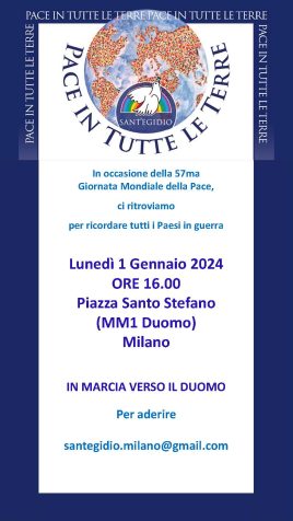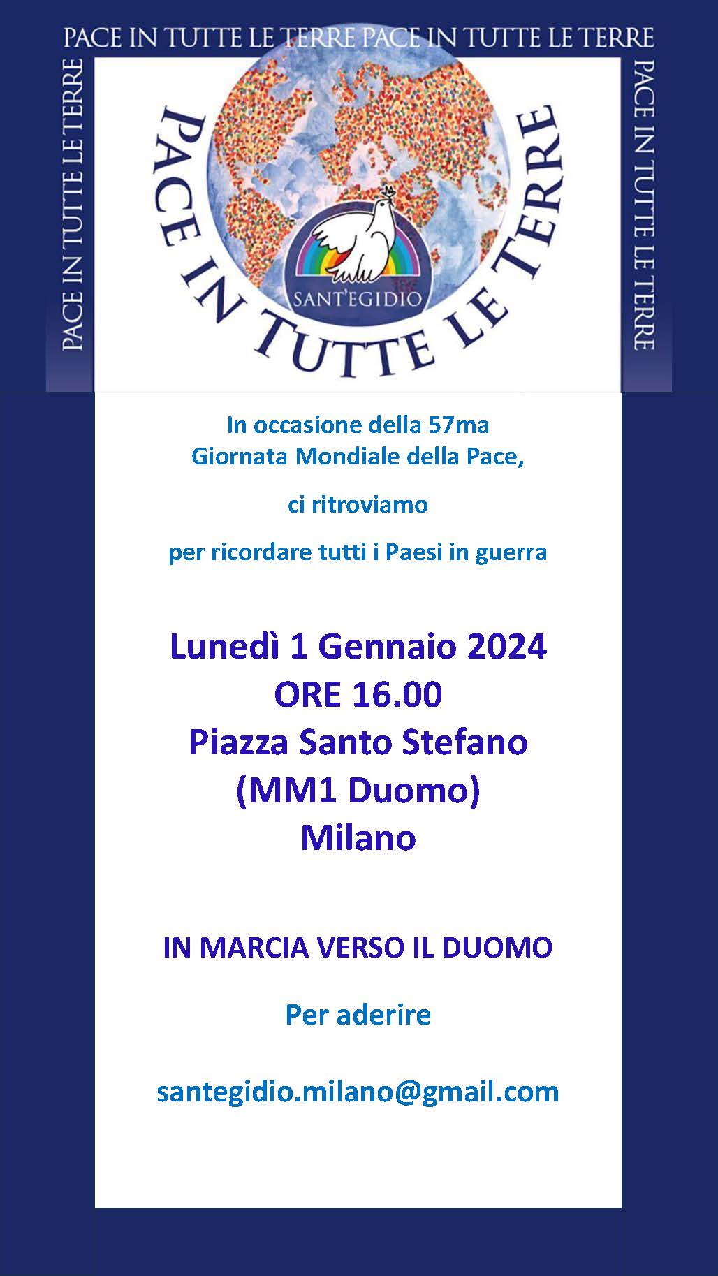 Nel nuovo anno la “geografia del dolore” si allarga, si legge in un comunicato di Sant’Egidio di Milano, “con un particolare pensiero al conflitto in Terra Santa iniziato il 7 ottobre scorso. Per questo Sant’Egidio organizza, per il giorno di Capodanno, marce, manifestazioni e iniziative pubbliche in centinaia di città di tutti i continenti. Il nostro pensiero andrà ai tanti popoli ancora vittime dei conflitti e del terrorismo, ai profughi che rischiano la vita in mare e hanno diritto al soccorso”. Il percorso della manifestazione di Milano partirà da piazza Santo Stefano, farà tappa alla chiesa di San Vito al Pasquirolo dove pregano abitualmente gli ortodossi russi e ucraini, quindi terminerà in piazza Duomo. Verranno ricordati i nomi di tutti i Paesi ancora coinvolti dai conflitti e dalla violenza nei diversi continenti; si ascolteranno testimonianze dai conflitti, in particolare dall’Ucraina e dall’Afghanistan.