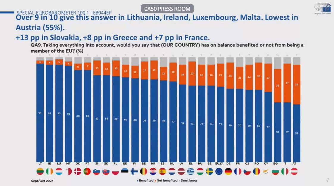 La presidente del Parlamento europeo Roberta Metsola, commentando i risultati dell’indagine Eurobarometro diffusi questa mattina, afferma: “Questo Eurobarometro dimostra che l’Europa conta. In questo difficile contesto geopolitico e socioeconomico, i cittadini confidano che l’Unione europea trovi soluzioni. La stragrande maggioranza degli europei ritiene che le azioni dell’Ue abbiano avuto un impatto positivo sulla loro vita quotidiana”.
