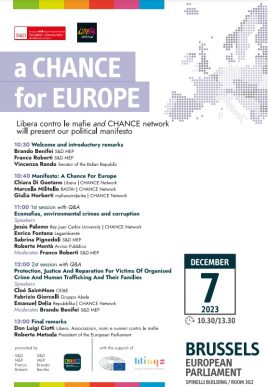“Una Chance per l’Europa”: i 5 punti e le 12 proposte del Manifesto politico di Libera. Associazioni, nomi e numeri contro le mafie e delle associazioni della società civile europea riunite nella rete Chance – Civil Hub Against orgaNised Crime in Europe, viene presentato oggi presso l’edificio Spinelli del Parlamento europeo. Sono presenti, tra gli altri, Roberta Metsola, presidente del Parlamento europeo, Luigi Ciotti, presidente di Libera, eurodeputati e rappresentanti della società civile. L’evento, ospitato dagli eurodeputati Franco Roberti e Brando Benifei, “è l’occasione per avviare un dibattito su cinque questioni fondamentali per contrastare la criminalità organizzata, che è necessario porre in cima all’agenda politica europea”. Si svolgono due sessioni tematiche, una sull’accesso alla giustizia e sulla protezione delle vittime della criminalità e della tratta di esseri umani, l’altra su corruzione, ecomafie e crimini ambientali. “L’iniziativa – precisano i promotori – fa parte di un percorso di avvicinamento alle elezioni del Parlamento europeo del 2024 e avviene nell’ambito del progetto finanziato con fondi della Commissione europea Eu Youth in Action, per il quale le associazioni di Chance hanno tenuto, nel corso dell’anno, 12 tavole rotonde di sensibilizzazione e advocacy in altrettante città europee, contribuendo a consolidare gli spazi di dialogo tra società civile responsabile e istituzioni, a livello locale e nazionale, sulle cinque questioni che oggi sono sottoposte all’attenzione delle istituzioni europee”.