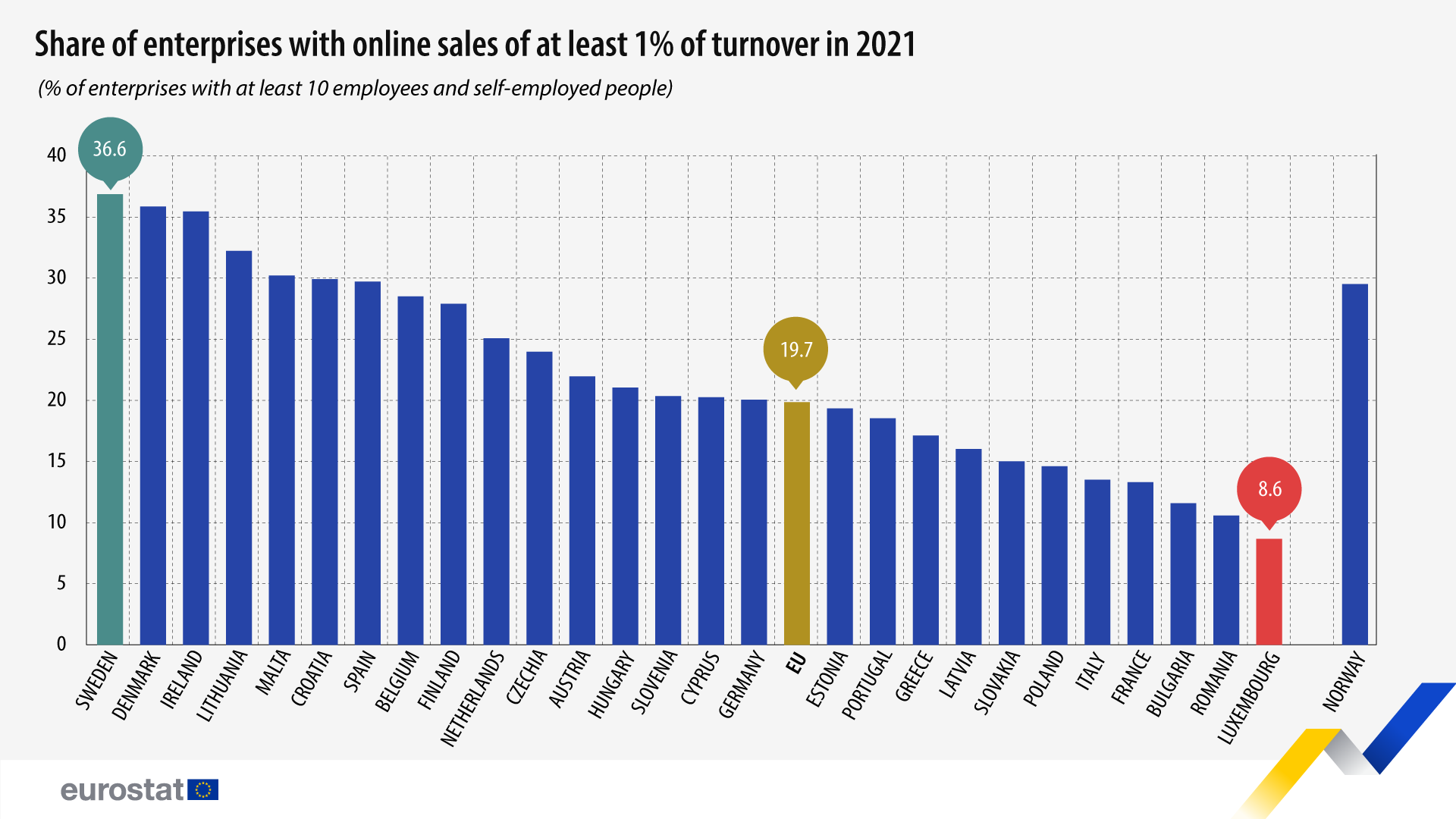 Le vendite online delle imprese europee continuano ad aumentare. In Svezia si registra il maggior numero di vendite su internet. Lo comunica Eurostat in uno studio diffuso oggi. Nel 2021, per il 19,7% delle imprese Ue, le vendite online hanno raggiunto almeno l’1% del fatturato totale, con un aumento di 0,7 punti percentuali (pp) rispetto al 2020. Tra queste, la Svezia ha registrato la quota più elevata con il 36,6%, seguita da Danimarca (35,6%) e Irlanda (35,2%). Lussemburgo (8,6%), Romania (10,5%) e Bulgaria (11,5%) hanno registrato le quote più basse. L’Italia si colloca sotto la media Ue. Gli incrementi più significativi delle imprese Ue sono stati registrati in Finlandia (27,7%; +4,2 punti percentuali), Spagna (29,5%; +3,7 pp) e Malta (30,0%; +3,3 pp). Sono invece diminuite le imprese che vendono online in Danimarca (35,6%; -2,7 pp), Grecia e Belgio (rispettivamente 17,0% e 28,3%; entrambi -2,3 pp). “Il 19,4% di tutte le imprese Ue ha dichiarato di aver effettuato vendite online tramite siti web o app nel 2021, sia a consumatori privati (15,6% delle imprese) che ad aziende e amministrazioni pubbliche (13,1%)”. Una piccola percentuale ha utilizzato sistemi di electronic-data-interchange-type per vendere ai propri clienti commerciali (6,0%). Le imprese hanno venduto tramite il loro sito web o app (16,6%) o su un mercato di e-commerce (8,6%). Più frequenti le vendite a clienti del proprio Paese (18,5%), rispetto a clienti di altri Paesi membri (8,1%) e del resto del mondo (4,6%).