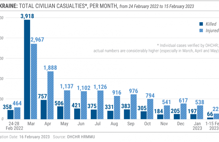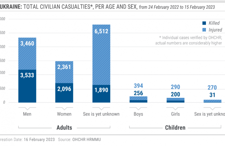 Dal 24 febbraio 2022, che ha segnato l’inizio dell’attacco armato su larga scala in Ucraina da parte della Federazione Russa, al 15 febbraio 2023, l’Ufficio dell’Alto Commissario delle Nazioni Unite per i diritti umani (Ohchr) ha registrato 21.293 vittime civili in 1.141 insediamenti dell’Ucraina, di cui 8.006 persone uccise e 13.287 ferite. Sempre nello stesso periodo, l’Ufficio delle Nazioni Unite ha registrato 1.441 vittime tra i bambini: 487 morti e 954 feriti.