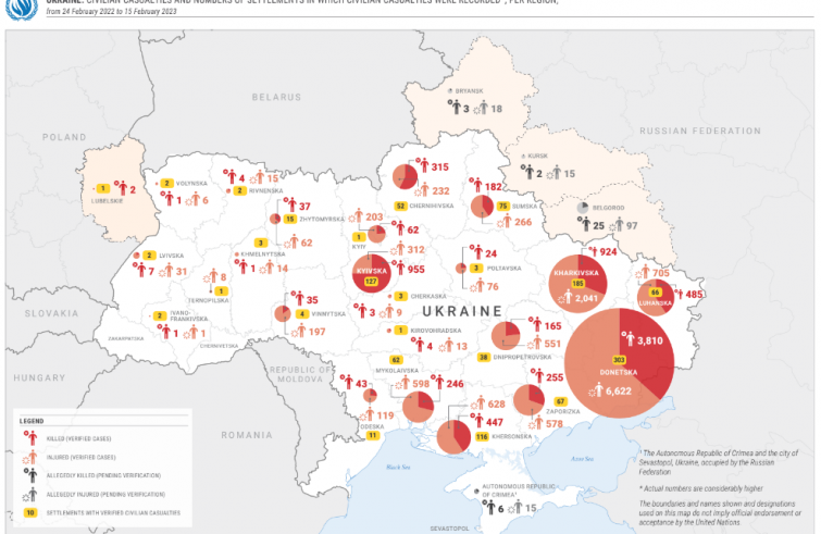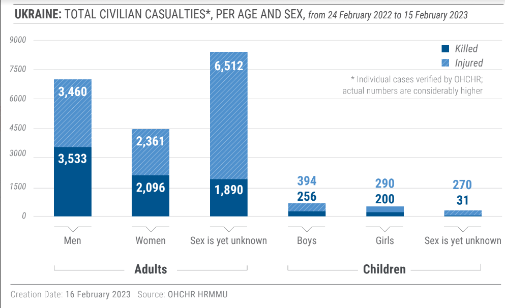 Dal 24 febbraio 2022, che ha segnato l’inizio dell’attacco armato su larga scala in Ucraina da parte della Federazione Russa, al 15 febbraio 2023, l’Ufficio dell’Alto Commissario delle Nazioni Unite per i diritti umani (Ohchr) ha registrato 21.293 vittime civili in 1.141 insediamenti dell’Ucraina, di cui 8.006 persone uccise e 13.287 ferite. Sempre nello stesso periodo, l’Ufficio delle Nazioni Unite ha registrato 1.441 vittime tra i bambini: 487 morti e 954 feriti.
