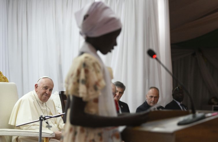 “In Sud Sudan i giovani crescono facendo tesoro dei racconti degli anziani e, se la narrativa di questi anni è stata caratterizzata dalla violenza, è possibile, anzi, è necessario inaugurarne, a partire da voi, una nuova: una nuova narrativa dell’incontro, dove quanto si è patito non sia dimenticato, ma venga abitato dalla luce della fraternità; una narrativa che metta al centro non solo la tragicità della cronaca, ma il desiderio ardente della pace”. E’ il messaggio del Papa ai giovani del Sud Sudan, durante l’incontro con gli sfollati interni alla Freedom Hall, che attualmente ospita 33 mila persone. “Siate voi, giovani di etnie diverse, le prime pagine di questa narrativa!”, l’esortazione di Francesco: “Se i conflitti, le violenze e gli odi hanno strappato via dai buoni ricordi le prime pagine di vita di questa Repubblica, siate voi a riscriverne la storia di pace! Io vi ringrazio per la vostra forza d’animo e per tutti i vostri gesti di bene, che sono tanto graditi a Dio e rendono prezioso ogni giorno che vivete. Vorrei rivolgere una parola grata anche a quanti vi aiutano, spesso in condizioni non solo difficili, ma emergenziali. Grazie alle comunità ecclesiali per le loro opere, che meritano di essere sostenute, ai missionari, alle organizzazioni umanitarie e internazionali, in particolare alle Nazioni Unite per il grande lavoro che svolgono. Certo, un Paese non può sopravvivere di sostegni esterni, per lo più avendo un territorio tanto ricco di risorse! Ma ora sono estremamente necessari. Vorrei anche onorare i tanti operatori umanitari che hanno perso la vita, ed esortare al rispetto per chi aiuta e per le strutture di sostegno alla popolazione, che non possono diventare obiettivi di assalti e vandalismi”.