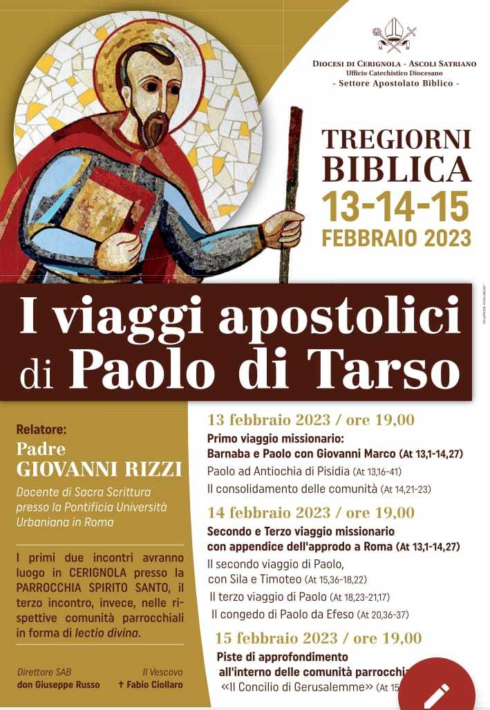 Appuntamento dal 13 al 15 febbraio nella diocesi di Cerignola per la TreGiorni Biblica, quest’anno centrata su “I viaggi apostolici di Paolo di Tarso”. Organizzata dal Settore “Apostolato Biblico”, guidato da don Giuseppe Russo, dell’Ufficio catechistico diocesano, l’iniziativa sarà animata da padre Giovanni Rizzi, religioso dei chierici regolari di San Paolo, noti come “Barnabiti”, docente di Sacra Scrittura nella Pontificia Università Urbaniana in Roma. Con inizio alle ore 19, i primi due incontri (lunedì e martedì) si svolgeranno nella chiesa parrocchiale dello Spirito Santo a Cerignola, mentre l’ultimo (mercoledì), nella forma della “lectio divina”, si terrà nelle rispettive comunità parrocchiali. Indirizzata ai catechisti, ai formatori e agli operatori pastorali, l’iniziativa è aperta a tutti.