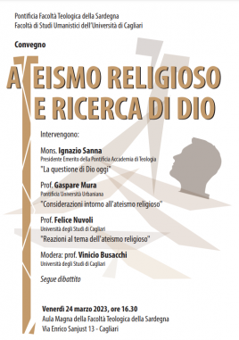 È in programma per venerdì 24 marzo, alle ore 16,30 nell’aula magna della Facoltà teologica della Sardegna di Cagliari, il convegno dal titolo “Ateismo religioso e ricerca di Dio”, al quale prenderanno parte mons. Ignazio Sanna, presidente emerito della Pontificia Accademia di Teologia, sul tema “La questione di Dio oggi”, Gaspare Mura della Pontificia Università Urbaniana, che affronterà l’argomento “Considerazioni intorno all’ateismo religioso”, e Felice Nuvoli dell’Università degli studi di Cagliari sul tema “Reazioni al tema dell’ateismo religioso”. L’incontro sarà moderato da Vinicio Busacchi dell’Università degli studi di Cagliari, ed è organizzato dalla Facoltà teologica della Sardegna e dalla Facoltà di studi umanistici dell’Università di Cagliari in occasione della pubblicazione dell’ultimo numero di Path dal titolo “Ateismo religioso e ricerca di Dio”.