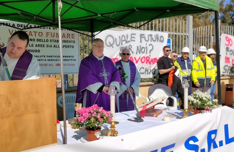 “Vengo qui per esprimere la vicinanza della Chiesa alle vostre giuste rivendicazioni, la nostra solidarietà davanti a una situazione così complessa, e con la richiesta di chiarezza nei confronti dell’azienda”. Lo ha affermato ieri mattina, il vescovo di Ales-Terralba, mons. Roberto Carboni, che ha presieduto davanti ai cancelli della Portovesme srl di San Gavino Monreale la messa, concelebrata dai sacerdoti operanti a San Gavino, don Pier Angelo Zedda, don Elvio Tuveri e don Mario Meloni, e a don Marco Statzu, direttore dell’Ufficio diocesano per la Pastorale sociale e del lavoro, insieme con gli operai, gli impiegati, le loro famiglie, gli amministratori del territorio e tante persone giunte per far sentire la loro voce.