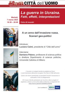 “A un anno dall’invasione russa. Scenari geo-politici”: è il titolo di una conferenza proposta da “Città dell’uomo” per martedì, 7 marzo (18.30-20.00), nell’ambito del ciclo di incontri intitolato “La guerra in Ucraina. Fatti, effetti, interpretazioni”. Introduce Luciano Caimi, presidente di “Città dell’uomo”; interviene Damiano Palano, professore di Scienza politica e direttore del Dipartimento di scienze politiche all’Università Cattolica di Milano.