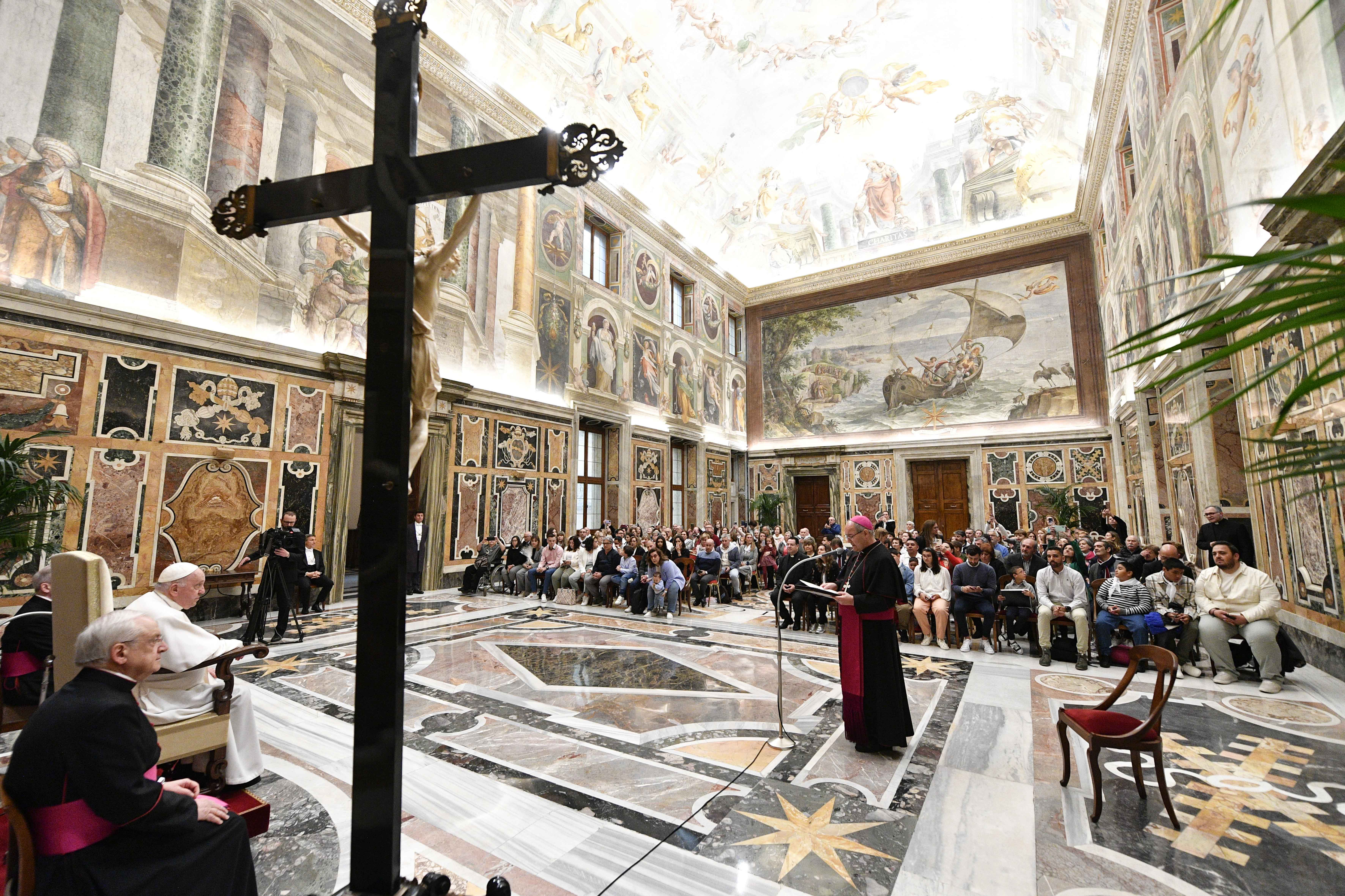 “Il cammino della vita è come quella Via Crucis che organizzate ogni anno per accompagnare il Nazareno. Da una parte bisogna preparare tante cose, ascoltare, imparare, sperimentare; aiutarsi, insomma, avendo spesso l’umiltà di riconoscere che da soli non ce la facciamo. Poi bisogna chiedere al Signore il coraggio di uscire in strada, portando la sua immagine perché tutti la possano contemplare. E così porti Gesù agli altri, anche se non te ne accorgi, e lo porti con i tuoi gesti, con i tuoi canti, con le tue preghiere. Ed è bello che nella nostra piccolezza possiamo essere testimoni di Gesù, missionari della sua misericordia, missionari del suo amore!”. Sono queste le parole con le quali Papa Francesco ha salutato i membri della “Fundación Madre Esperanza de Talavera de la Reina” di Toledo, ricevuti in udienza questa mattina in Vaticano per i 50 anni dalla fondazione. “Nella vita, come in quella Via Crucis, tutti abbiamo un lavoro, un compito. Gesù ci guarda ed è contento della nostra fatica e dell’amore che siamo capaci di trasmetterci”, ha proseguito Bergoglio evidenziando l’importanza del lavoro di squadra capace di far convergere le diverse capacità di ciascuno in un risultato finale che appartiene a tutti. “Tutti insieme, con Gesù, possiamo fare tante cose buone. E così siete le mani di Gesù, quando lavorate insieme. Siete anche i suoi piedi, la sua voce, il suo cuore”, le parole di Papa Francesco che ha indicato lo scopo di ognuno ogni giorno, “almeno per i prossimi cinquant’anni: lavorare insieme e ringraziare pieni di gioia perché Gesù ci ha scelti per questa grande missione”.