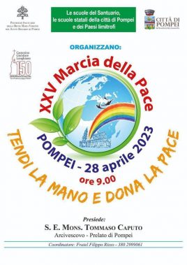 A Pompei, venerdì 28 aprile, si rinnoverà l’appuntamento con la Marcia della pace, giunta quest’anno alla 25ª edizione. Presieduta dall’arcivescovo Tommaso Caputo e patrocinata dal comune di Pompei, coinvolgerà i ragazzi delle scuole di Pompei e delle città limitrofe. “Se cerchi salvezza, propaga il Rosario” e “Tendi la mano e dona la pace” saranno gli slogan della manifestazione che vedrà protagonisti circa 10.000 studenti, 6 bande musicali, 4 gruppi di majorettes, autorità civili, militari e religiose. L’inizio della marcia è previsto per le 9.30. Gli studenti delle scuole di ogni ordine e grado della città mariana e dei comuni vicini si sono dati appuntamento in diversi punti della città per dare il via al corteo, che si ritroverà, infine, in piazza Bartolo Longo, dove si svolgerà il momento clou della manifestazione, introdotto, come da tradizione, da fratel Filippo Rizzo dei Fratelli delle Scuole cristiane (Fsc), direttore del Centro educativo “Bartolo Longo” e storico organizzatore della manifestazione dedicata ai giovani.