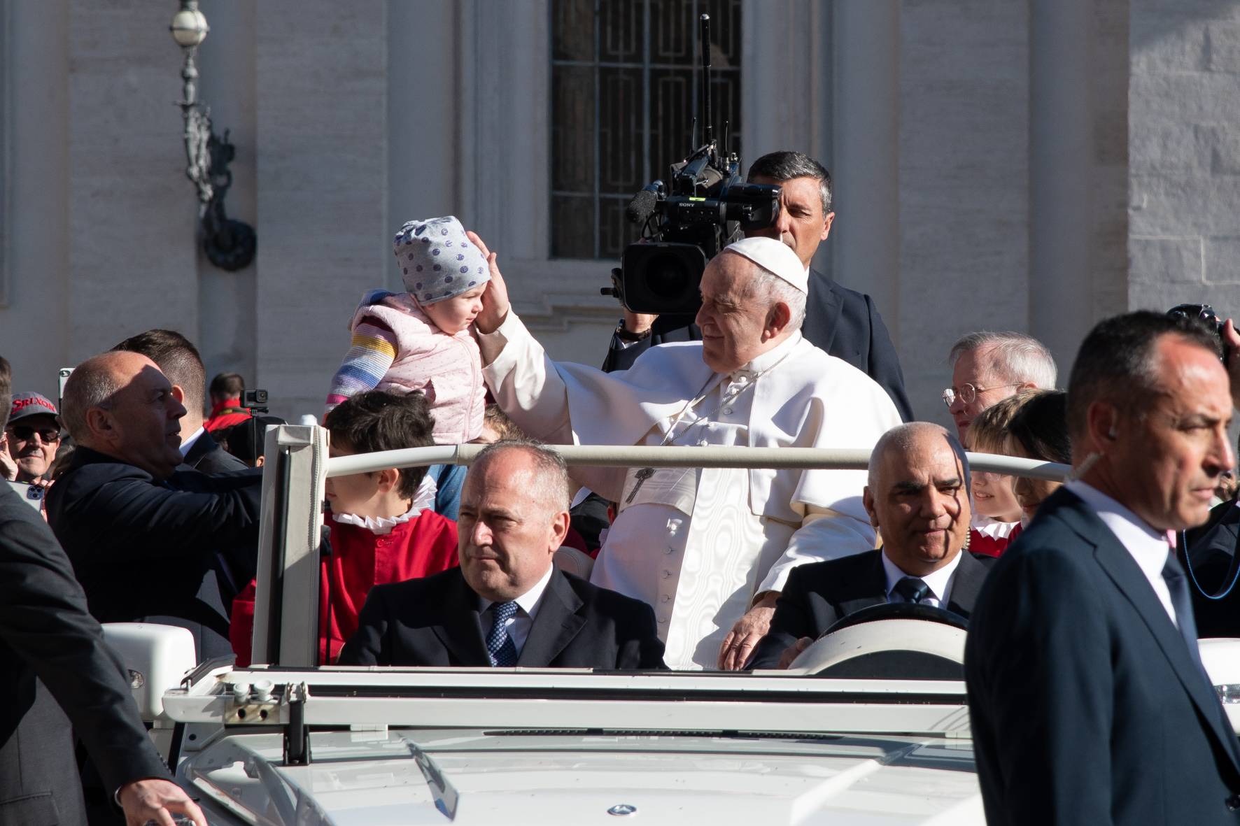 Papa Francesco ha iniziato anche oggi l’udienza del mercoledì facendo salire a bordo della jeep bianca scoperta sei bambini, maschi e femmine, tutti in divisa rossa con colletto bianco. Mentre si godevano il giro tra i vari settori della piazza delimitati dal colonato del Bernini, il Papa ha baciato e accarezzato i bambini che i solerti uomini della Gendarmeria vaticana hanno sottoposto, di volta in volta, al suo abbraccio. Oggi piazza San Pietro, baciata da un sole primaverile e da un cielo terso d’azzurro, è gremita di fedeli in ogni ordine di posto. In prima fila quelli accalcati lungo le transenne, muniti dell’immancabile telefonino per le foto e i selfie, al passaggio della papamobile. Molte le bandiere e gli striscioni, tra cui uno che recita: “Papa Francesco i sordi ti amano”.