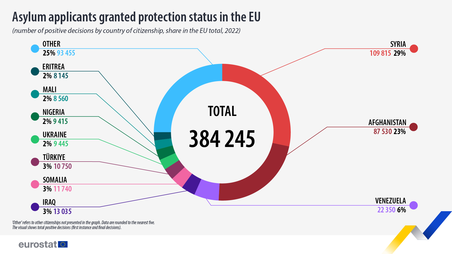 “Nel 2022, i Paesi dell’Ue hanno concesso lo status di protezione a 384.245 richiedenti asilo, in aumento del 40% rispetto al 2021 (275.040)”. Queste informazioni provengono dai dati sulle decisioni in materia di asilo pubblicati oggi da Eurostat. Tra i richiedenti asilo a cui è stato concesso lo status di protezione nel 2022 nell’Unione, il 44% ha ricevuto lo status di rifugiato, il 31% ha ricevuto protezione sussidiaria e il 25% ha ricevuto protezione umanitaria. Rispetto al 2021, il numero di status di rifugiato concesso è aumentato – come spiegano a Eurostat, del 22%, la protezione sussidiaria è aumentata del 48% e la protezione umanitaria ha registrato l’incremento maggiore con il 72%. “Il numero più alto di persone che hanno ricevuto lo status di protezione è stato segnalato dalla Germania (159.365, 41% del totale Ue), davanti a Francia (49.990, 13%), Italia (39.660, 10%) e Spagna (35.765, 9%). Insieme, questi quattro Paesi hanno concesso il 73% delle richieste di protezione a livello Ue”. Il gruppo più numeroso che ha ottenuto lo status di protezione nell’Ue nel 2022 è stato quello dei siriani (il 29% del numero totale di persone a cui è stato concesso lo status di protezione). Seguono afgani (23%) e venezuelani (6%). Alla maggior parte dei siriani (68%) e degli afgani (55%) è stato concesso lo status di protezione in Germania, mentre quasi tutti i venezuelani (92%) hanno ottenuto lo status di protezione in Spagna.