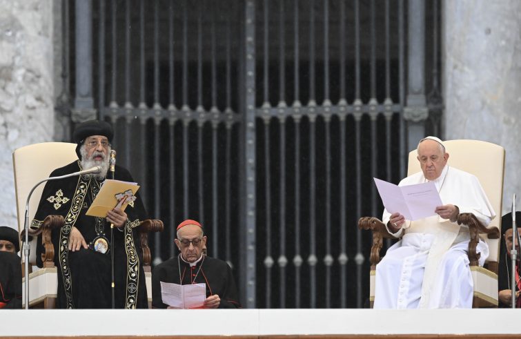 “Tutti esorto a pregare la Vergine Maria, nel mese a lei dedicato. A lei, consolatrice degli afflitti e Regina della pace, affido la martoriata Ucraina”. E’ il saluto del Papa ai fedeli di lingua italiana riuniti, sotto la pioggia, in piazza San Pietro per l’appuntamento del mercoledì, che oggi ha assunto una veste inedita. “Mentre partecipate alle preghiere mariane di maggio, recitando il Rosario, ricordatevi soprattutto delle donne e dei bambini afflitti dalla guerra”, l’invito ai fedeli di lingua portoghese, salutati poco prima. “San Francesco Saverio ci insegna che l’annuncio del Vangelo nelle periferie del mondo va sempre di pari passo con l’assistenza medica ed educativa”, le parole di Francesco: “Questo sostegno, così come la nostra preghiera per la pace, è necessario anche per la martoriata Ucraina”. “E adesso, tutti insieme con il patriarca Tawadros II, pregheremo il Padre Nostro”, ha annunciato a braccio al termine dell’udienza: “E poi il patriarca Tawadros II e io daremo la benedizione”. Prima di congedarsi dalla piazza, Papa Francesco ha salutato la delegazione che accompagna il patriarca, posando per la foto di rito.