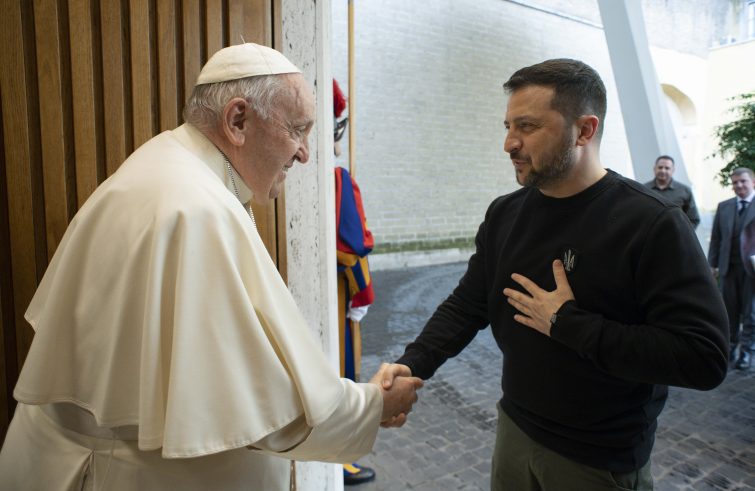 “La ringrazio per questa visita”. Sono le parole rivolte dal Papa al presidente ucraino Volodymyr Zelensky, all’inizio del colloquio privato in Auletta Paolo VI. All’ingresso dell’Aula, dopo essere stato accolto da mons. Leonardo Sapienza, reggente della Casa Pontificia, alla vista di Papa Francesco che gli andava incontro ha fatto un cenno di inchino col capo, portandosi la mano al cuore, e ha detto: “È un grande onore”. Poi i due si sono recati nell’Auletta e il presidente dell’Ucraina ha preso posto sulla sua poltrona. Prima di sedersi a sua volta, il Santo Padre si è rivolto a Zelensky dicendogli: “La ringrazio per questa visita”. Il Papa ha regalato al presidente ucraino una scultura in bronzo con un ramoscello d’ulivo e Zelensky, a sua volta, ha regalato a Francesco un’icona di una Madonna disegnata sui resti di un giubbotto antiproiettile.