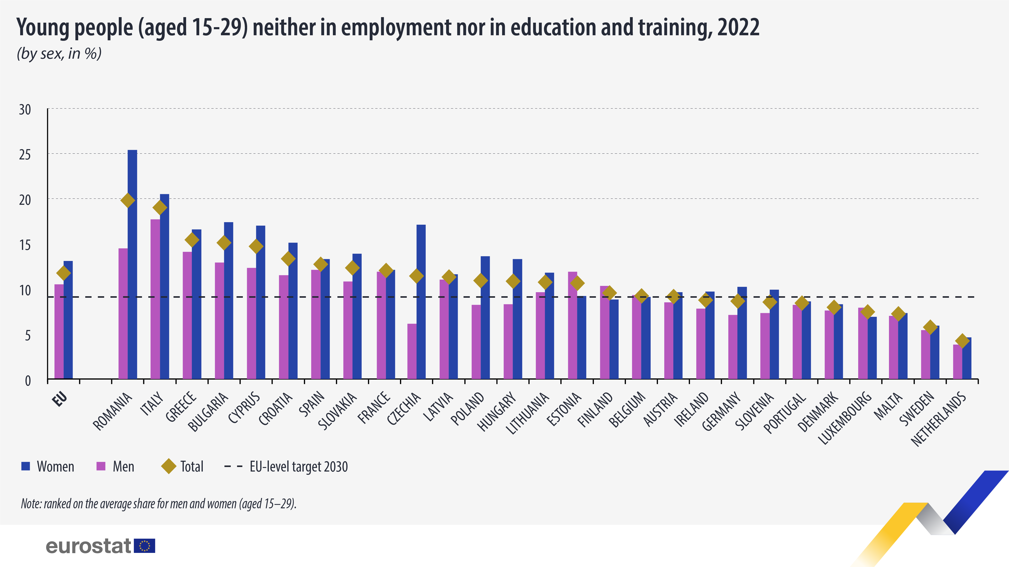 Tra i Paesi dell’Ue, nel 2022 si sono registrate ampie variazioni osservando i tassi di neet per la fascia di età 15-29. La percentuale variava dal 4,2% nei Paesi Bassi a una quota quasi 5 volte superiore in Romania (19,8%). I dati mostrano che, nel 2022, un terzo dei membri dell’Ue era già al di sotto dell’obiettivo del 9%, vale a dire Paesi Bassi, Svezia, Malta, Lussemburgo, Danimarca, Portogallo, Slovenia, Germania e Irlanda. Nella maggior parte dei Paesi Ue, la percentuale di neet femminile è più elevata di quella maschile.