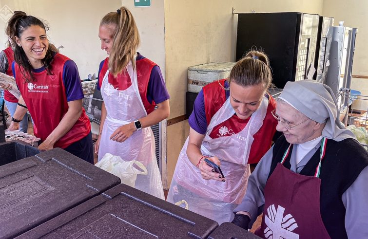 Hanno aiutato a preparare e servire i pasti per i poveri, lavorando insieme ai volontari che ogni giorno cucinano il pranzo a chi ha più bisogno nella mensa di via Baracca. Protagoniste le calciatrici della Fiorentina, guidate dalla capitana Alice Tortelli. Prosegue così, con la Squadra Femminile, la collaborazione tra la Acf Fiorentina e la Fondazione Solidarietà Caritas di Firenze, inaugurata ad aprile. Le giocatrici hanno visitato la mensa cittadina gestita dalla Fondazione, dove ogni giorno vengono offerti 300 pasti, dando il loro contributo nel servizio, dalla selezione degli alimenti, alla preparazione di frutta e insalata fino alla distribuzione delle pietanze. L’iniziativa ha lo scopo di sensibilizzare ancor di più i tifosi viola sull’essenzialità e necessità dei servizi volti ad aiutare le frange più a rischio della comunità cittadina, attraverso l’impegno degli atleti e delle atlete e delle persone che lavorano in Fiorentina.