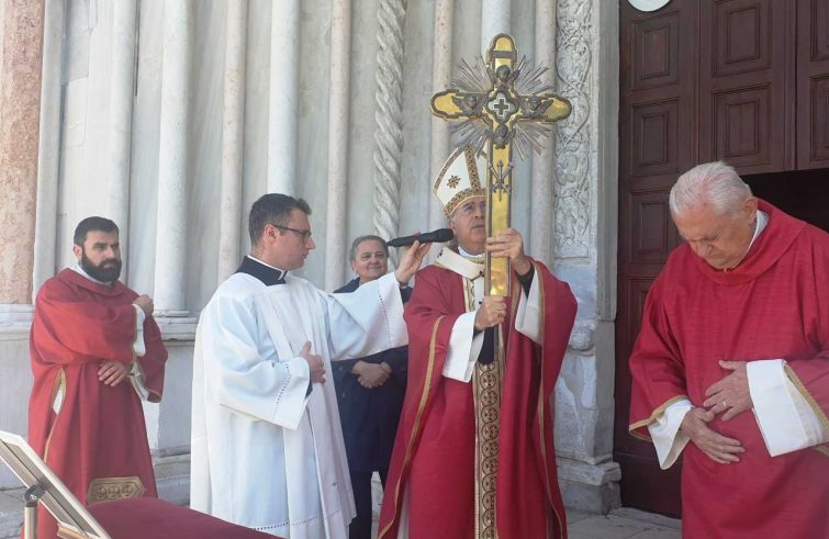 ha offerto l’omaggio floreale a San Ciriaco. Secondo quanto riferito dall’arcidiocesi, per la prima volta è stato suonato e cantato l’inno a San Ciriaco, eseguito dalla Cappella musicale San Ciriaco e composto dallo stesso arcivescovo che nell’omelia ha ricordato il significato della Croce di Cristo e che “La testimonianza che oggi ci viene richiesta è la compassione verso tutti, specialmente verso coloro che sono segnati dalla povertà, dalla malattia e dal dolore. Abbiamo bisogno di una Chiesa che parli fluentemente il linguaggio della carità, idioma universale che tutti ascoltano e comprendono, anche i più lontani, anche coloro che non credono”. Da qui l’appello: “Sia questa città di Ancona, città di storia, di cultura, di beati, città viva, porta di Oriente, via della pace, attenta alle nuove povertà, alcune purtroppo, di carattere strutturale.  Tante famiglie non hanno il minimo necessario in termini di beni e di servizi per vivere dignitosamente: cibo, casa, utenze domestiche, lavoro, sanità. È dalla croce di Cristo salvatore che attingiamo la forza e la speranza per un nuovo umanesimo. La politica nasce dalla città, dalla polis, dalla passione concreta per il vivere insieme garantendo diritti e rispettando doveri. Ci sia l’impegno di tutti a promuovere una ecologia ambientale: custodiamo il nostro mare. Questa città ha una particolarità: vede sorgere il sole dal mare e tramontare sul mare. Promuoviamo ogni giorno una ecologia umana con l’apertura agli altri, facendo accoglienza, prendendoci cura gli uni degli altri. San Ciriaco ancora una volta ci guidi ad abbracciare la croce gloriosa di Cristo salvatore, unica speranza, da cui attingere forza per un autentico umanesimo”.  Al termine della Messa, sul sagrato della Cattedrale, l’arcivescovo ha impartito la benedizione con il reliquiario, contenente un frammento della croce di Cristo e la reliquia del santo.