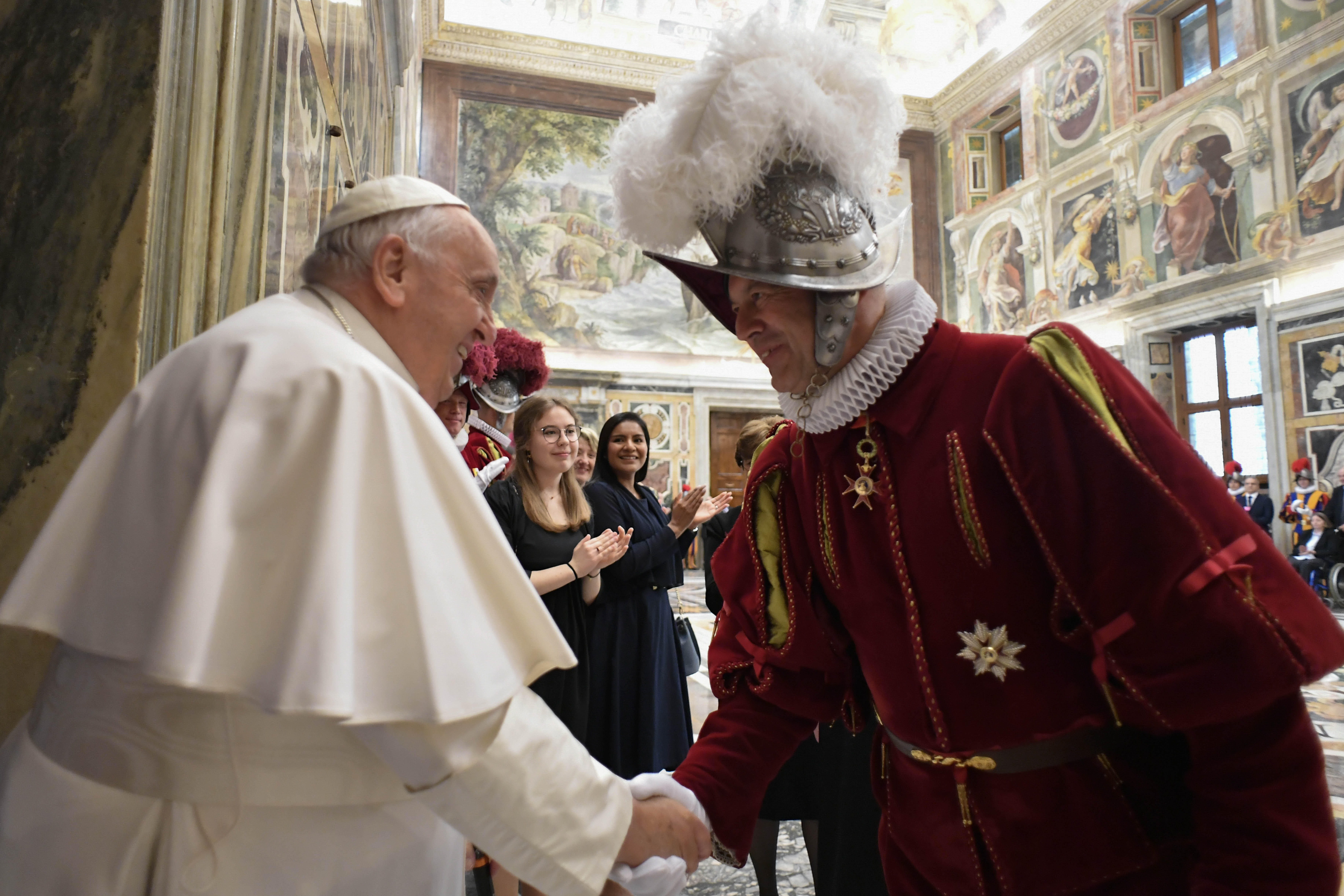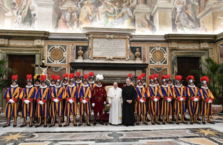 “La Guardia Svizzera Pontificia è una grande famiglia, una comunità vivace e fraterna, sia nei momenti di servizio che in quelli liberi da mansioni lavorative. E come la famiglia è un luogo di crescita, dove si imparano tante cose utili per la vita, così è nella Guardia: è un ambiente di formazione umana e cristiana per tutti. I giovani sono arricchiti dall’esperienza dei più anziani i quali, a loro volta, possono essere edificati e imparare dall’apertura dei giovani, dal loro entusiasmo che li porta a esplorare in continuazione, mossi da una positiva curiosità. In particolare a voi reclute dico: non smarrite il coraggio e la passione per scoprire cose nuove”. Lo ha affermato oggi Papa Francesco, ricevendo in udienza, nel Palazzo apostolico vaticano, la Guardia Svizzera Pontificia in occasione della festa del giuramento. “Mi piace pensare che la decisione di porre alcuni anni della vostra vita a disposizione del Papa e della Santa Sede non sia estranea al percorso personale di fede. La vostra missione qui in Vaticano è una strada che il Signore vi ha aperto per vivere il vostro Battesimo e rendere gioiosa testimonianza della fede in Cristo. Una fede che avete appreso in famiglia, coltivata in parrocchia e che manifesta l’intensità del legame dei cattolici svizzeri alla Chiesa di Roma. Siete chiamati a rendere ragione di questa fede anche nei vari posti di servizio”.