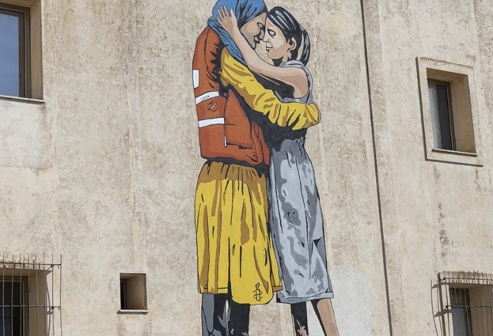 Laika, attivista e street artist romana, ha inaugurato oggi a Lampedusa un murale dal forte impatto emotivo ed emblematico, intitolato “Rise up together!”. L’opera è stata realizzata in collaborazione con Amnesty International Italia e con il Comune di Lampedusa e Linosa sulla facciata del Museo delle Migrazioni, luogo simbolo di incontro e solidarietà. Il murale raffigura la commovente immagine di un abbraccio tra due donne, una lampedusana e una persona migrante. L’opera vuole trasmettere la forza e la generosità dei cittadini e delle cittadine di Lampedusa nell’accogliere le persone migranti, un tributo all’isola e a tutti coloro che, nel corso degli anni, si sono prodigati per soccorrere chi, con grandi difficoltà, ha cercato di raggiungere l’isola via mare. ‘‘Questo murale è portatore di messaggi molto potenti: non si limita a rappresentare solamente l’accoglienza delle persone migranti da parte dei lampedusani ma va oltre. Ci sono due donne con storie diverse e problemi diversi che si incontrano in un abbraccio e si danno forza l’un l’altra. C’è chi ha abbandonato la propria terra e chi nella propria vive in condizioni difficili: ad esempio, a Lampedusa non c’è un ospedale”, ha dichiarato Laika. “In un mondo che ci vuole divisi bisogna lottare uniti. A tutte le donne: ‘Rise up together!’. Un grido che parte da e per Lampedusa, fino a Kalamata per arrivare a tutti i governi, per arrivare a Bruxelles”, ha concluso Laika. “Il murale di Laika a Lampedusa è molto più che un’opera d’arte urbana: è una testimonianza visiva e tangibile del potere trasformativo dell’arte e del suo ruolo nel dare voce ai messaggi di solidarietà e umanità”, ha dichiarato Francesca Corbo, di Amnesty International Italia. L’opera realizzata da Laika fa parte di un progetto più ampio, che vede Amnesty e il comune di Lampedusa unire le forze per promuovere e rafforzare la conoscenza dei diritti umani sull’isola. Questa collaborazione si estende ad altre iniziative che coinvolgono la musica e l’arte in generale.