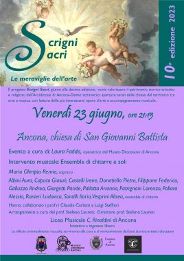 È in programma per domani, venerdì 23 giugno, alle 21.15, il nuovo appuntamento serale della rassegna estiva “Scrigni Sacri” che prevede l’apertura straordinaria alle visite della chiesa di San Giovanni Battista nel rione di Capodimonte ad Ancona. La visita è ad ingresso libero e sarà guidata da Laura Fadda, operatrice del Museo diocesano, con letture storico-artistiche, religiose e iconografiche, assieme all’ensemble di chitarre e soli del liceo musicale “C. Rinaldini” di Ancona. La chiesa è di origine duecentesca e nel 1884 venne assegnata ai Minori osservanti per sopperire alla perdita del loro vicino complesso monastico di San Francesco ad Alto. Al suo interno conserva due tele del XVI secolo, una del pittore anconetano Andrea Lilli “Gesù Crocifisso, San Carlo Borromeo e Sant’Ubaldo”, l’altra del vadese Federico Zuccari “Ecce Homo”, oltre che le reliquie del beato Gabriele Ferretti (1385-1456), religioso francescano dell’Ordine dei Frati minori proveniente dalla nobile famiglia anconetana dei Ferretti. Info; tel. 320.8773610 oppure www.museodiocesanoancona.it.