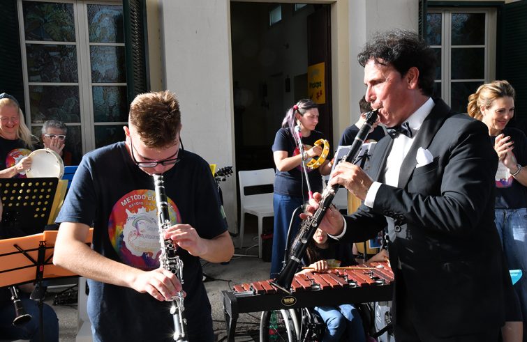 Sul “palco” dell’ospedale in riva al mare, i musicisti dell’Orchestra inclusiva Euterpe, un ensemble composto da bambini e ragazzi con disabilità accompagnati da ricercatori, terapisti, caregiver, volontari, musicisti amatoriali e professionisti con il compito principale di svolgere attività terapeutiche attraverso la musica.
